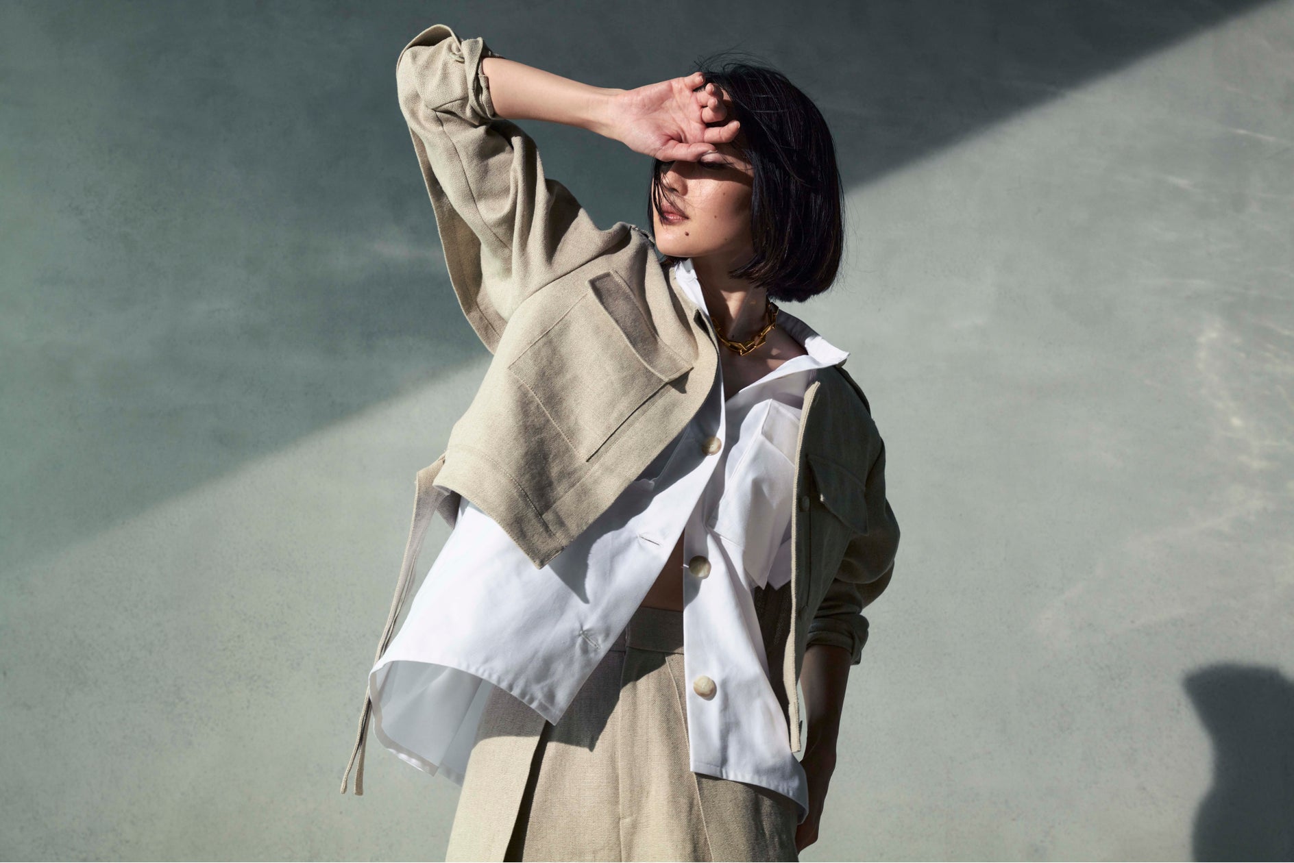 アシンメトリーなデザインと、本革のパイピングや胸元のベルト、ファンを隠したままの送風を可能にする立体的なヨークが、スタイリッシュでありながらもラグジュアリーな雰囲気を演出します。風を取り込んでもIラインを保つ凛とした佇まいで、アウトドアだけではなく、ビジネスやフォーマルなシーンでも着こなせる逸品です。