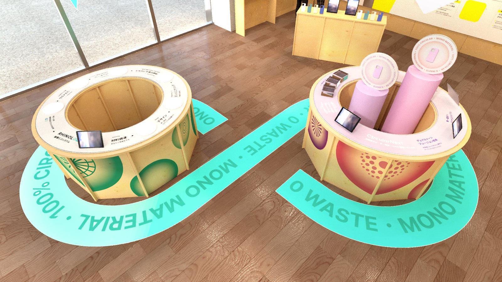 木材を用いたディスプレイ什器の一部は環境に配慮した設計となっており、イベントなどで数回使用した後にマテリアルリサイクルに回し、廃棄物を新たな製品の原料として再利用する計画を立てています。主力製品であるCircularNextが購入者の手に渡った後に生まれ変わっていくように、イベント什器も場所を変えて再利用されることで循環していきます。