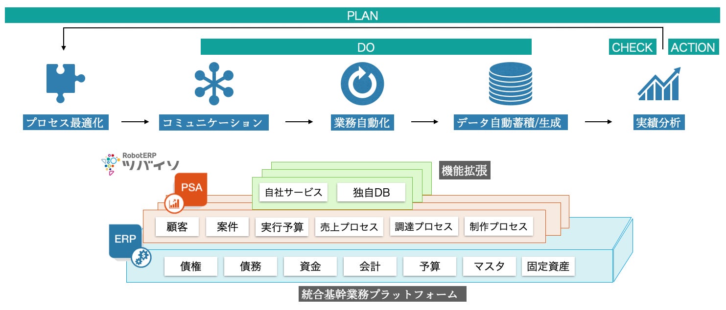 RobotERPツバイソは、企業をベストプラクティスの業務プロセスに最適化し、顧客と社内のコミュニケーションの強化、自動化により業務遂行力を強化します。蓄積、自動生成された管理会計データにより実績をチェックし、改善のアクションを行い、経営者はマーケット最適化したプランをファクトに基づいて立てることができるようになる、ERPよりも広い、新しい概念の統合基幹業務プラットフォームです。