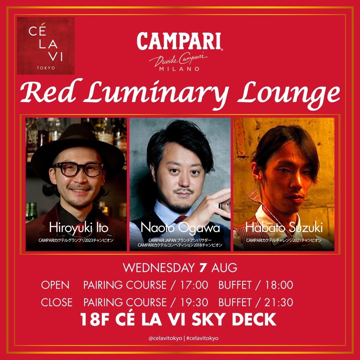 渋谷の夜空の下で繰り広げられる、CAMPARI JAPANとCÉ LA VI TOKYOによる特別な一夜「Red Luminary Lounge」をぜひご堪能ください。極上のカクテルと美食が織りなすラグジュアリーな時間をお楽しみいただけます。
