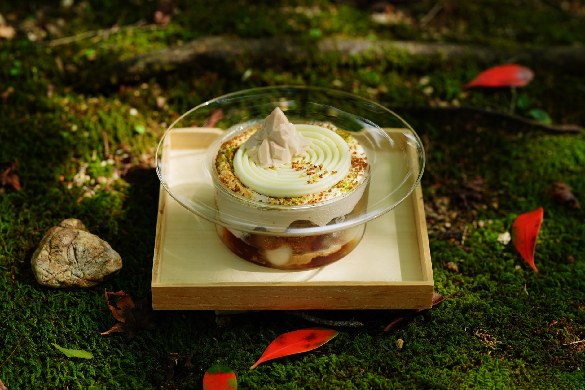 秋の季節は和紅茶と栗をテーマに、ボウルの中に自家製の和紅茶ジェラート・シフォン・ゼリーと季節の栗、白玉などを宝石のように詰め込みました。