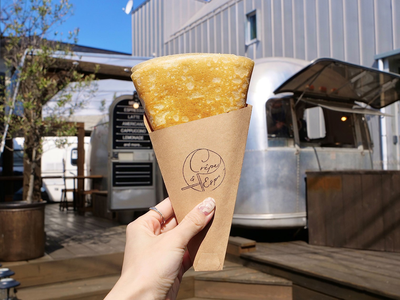 クレープ⽣地の美味しさを追求し、1年と半年をかけて開発した「⻩⾦に輝くパリパリクレープ」は パリパリ、サクサクといった⾷感とクッキーのような⾹ばしさが味わえる唯⼀無⼆のクレープです。