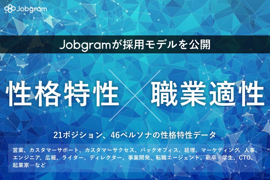 グラム株式会社(本社:東京都渋谷区、代表取締役:小出悠人)は、当社が開発・運営するJobgram(ジョブグラム)適性検査において、活躍する人物の理想像をデータ化した「採用モデル」として、21ポジション・46ペルソナの性格特性データを公開しました。
