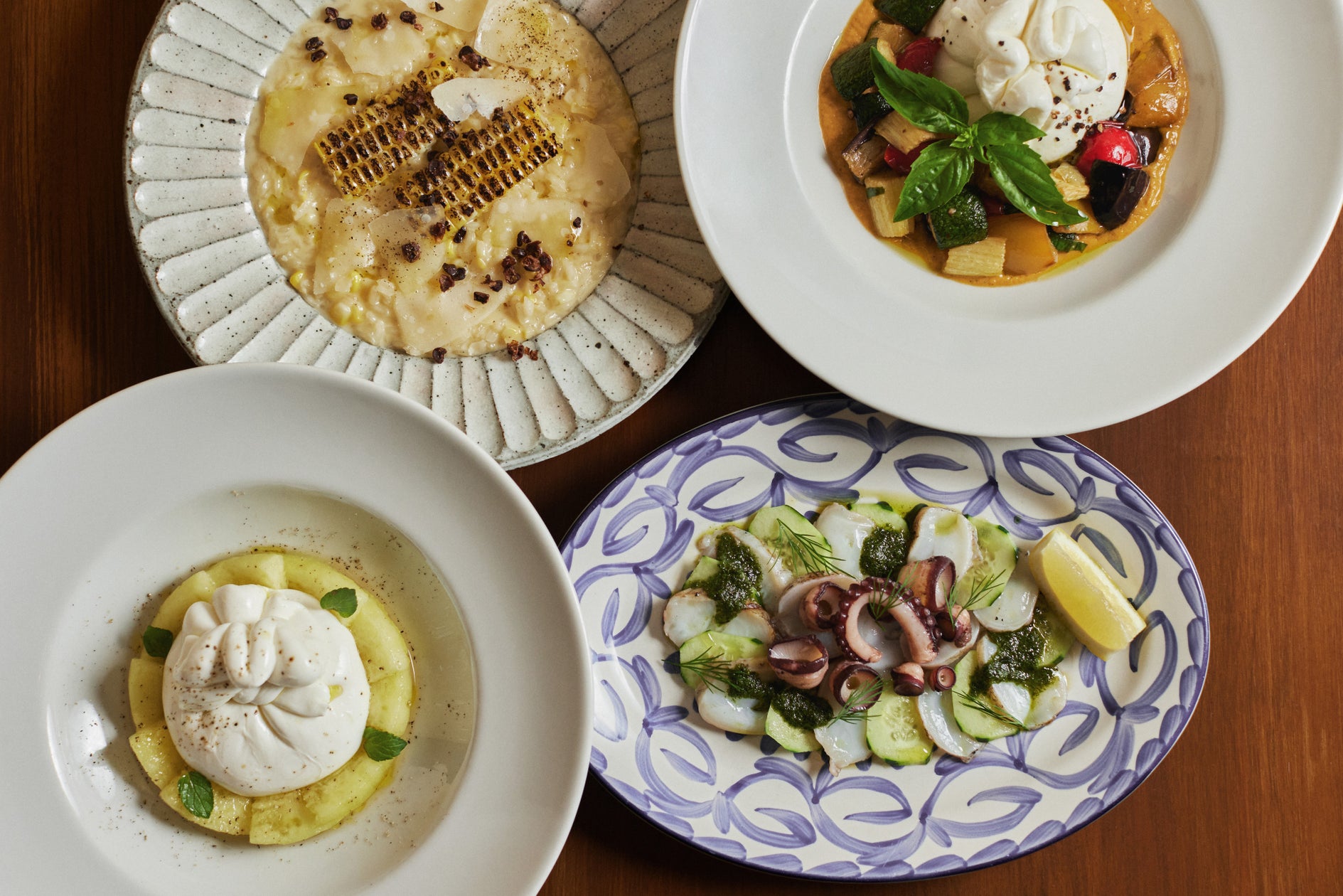 アラカルトメニューから、SHIBUYA CHEESE STANDのブッラータチーズをメロンの果肉とマンゴーソースでいただく「渋谷モッツアレラブッラータ 旬のフルーツ」と夏野菜をふんだんに添えた「渋谷モッツアレラブッラータ 旬野菜の取り合わせ」の2種が夏バージョンで登場。この時期、甘味が増すとうもろこしに豊かなチーズの風味を加えた「トウモロコシとパルミジャーノのリゾット」は、つぶつぶの食感と旨みが交ざりあい、ワインにもよく合う一皿です。