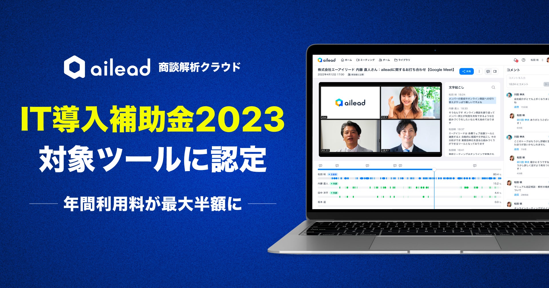 昨今の日本において少子高齢化が進行し、労働人口が減少する中で、多くの営業組織で業務効率化を推進することが必要とされています。バベルでは、より多くの営業組織に対して「ITツールの活用により業務効率化を実現して欲しい」という思いがあり、ITツール導入をサポートするIT導入事業者への登録ならびに、商談解析クラウド「ailead」を補助金対象ITツールに申請いたしました。今回、aileadが補助金対象ツールとして認定されたことにより、aileadを新たにご契約のお客様は年間利用料が最大半額でご利用いただけます。この機会にぜひご利用くださいませ。