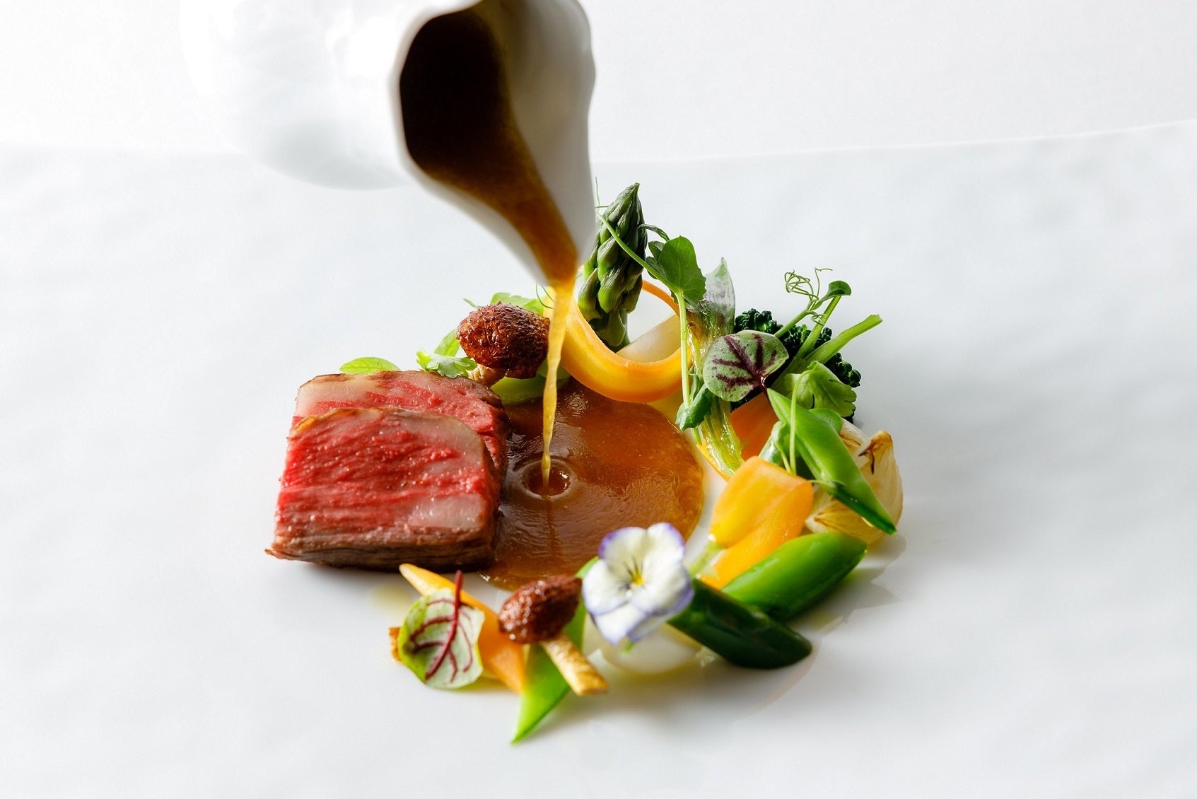 メニュー名の「ジャルディニエール」はフランス語で「庭園風」を意味します。お皿の上の庭園を楽しんでいただけるよう、色とりどりの福岡の季節野菜を盛り付けました。ソースは召し上がる直前にお客様の目の前でサービスし、香りを感じていただきます。お肉の旨味と野菜本来の味、さらには目でも楽しめる一品です。