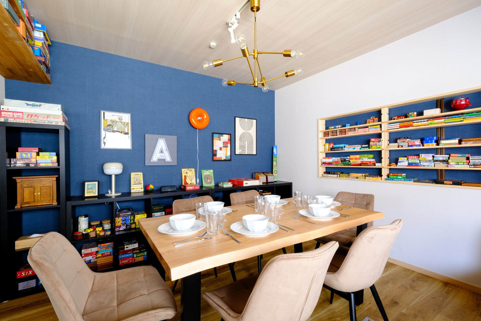民泊施設として活用するにあたって、所有者様からは、これまで集めてきたカードゲームやボードゲームなどのゲームコレクションを活かした施設にしてほしい、とのご要望をいただきました。所有者さまからご提供いただいた約250種類以上のゲームを宿泊中は自由に遊ぶことができ、「ワクワク泊まる」をコンセプトにした民泊施設「BOARD GAME HOUSE TOKYO」として再生する運びとなりました。本物件のリノベーションは、所有者様がご自身でDIYされている部分を活かしながら、床やタイル等の張替えや民泊として運営するための電気設備の整備、洗濯機置き場やエアコンを新設しました。また、本物件のテーマであるゲーム類がより引き立つように家具や内装デザイン、照明を選定し、ゲームを楽しむことを重視した内装となっています。