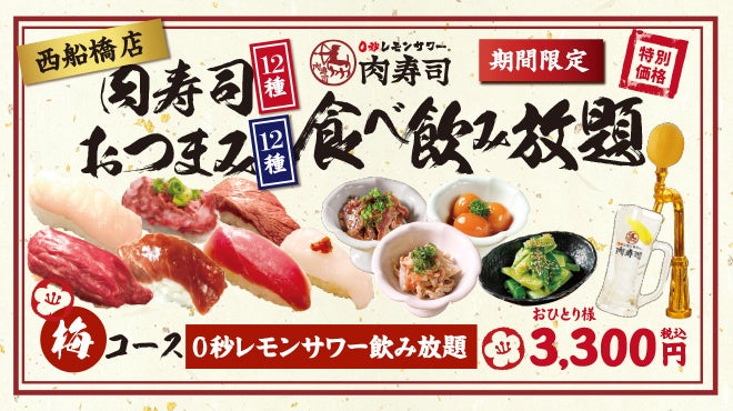 【梅コース】0秒レモンサワー付!肉寿司12種+おつまみ12種食べ飲み放題90分3,300円(税込)