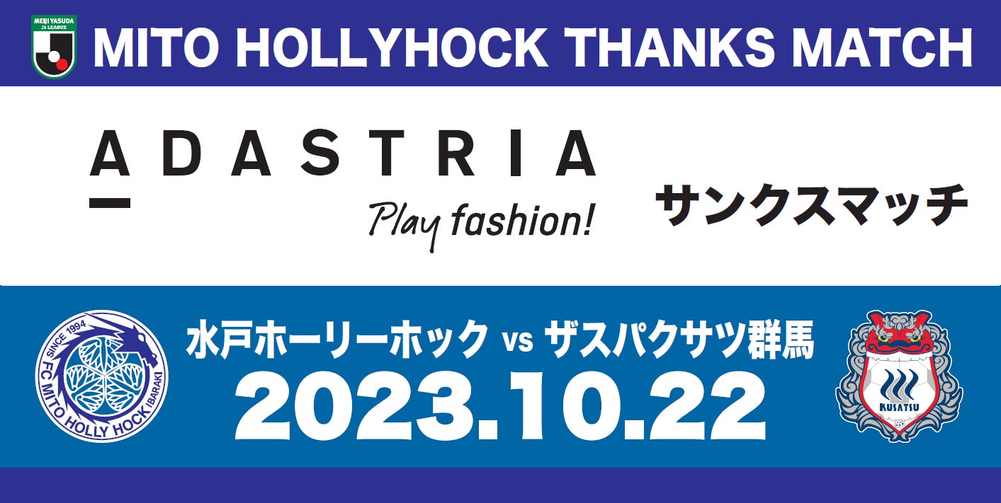 このたび、10月22日(日)に行われるホームゲーム『2023明治安田生命J2リーグ第39節 水戸ホーリーホック vs. ザスパクサツ群馬』をプラチナパートナーの株式会社アダストリア とともに『アダストリアサンクスマッチ』として開催いたします。