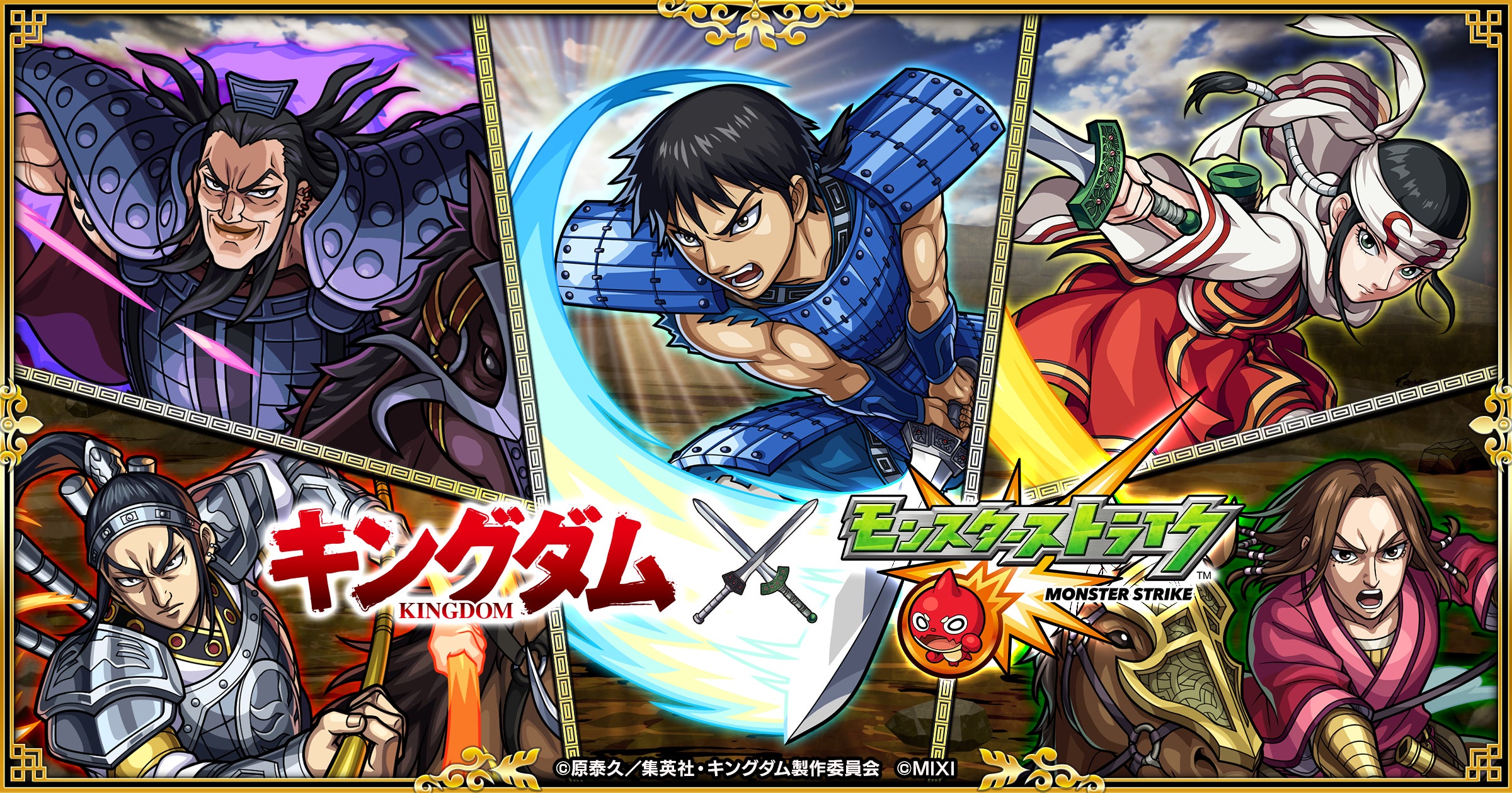 本コラボでは、秦軍に所属する「信」「羌瘣」「王騎」をはじめ、「王賁」「蒙恬」が期間限定のガチャに登場します。また、「コラボスターターパック」を購入することで、「楊端和」が入手できるほか、ログインや函谷関攻防戦の報酬として「河了貂」も入手できます。