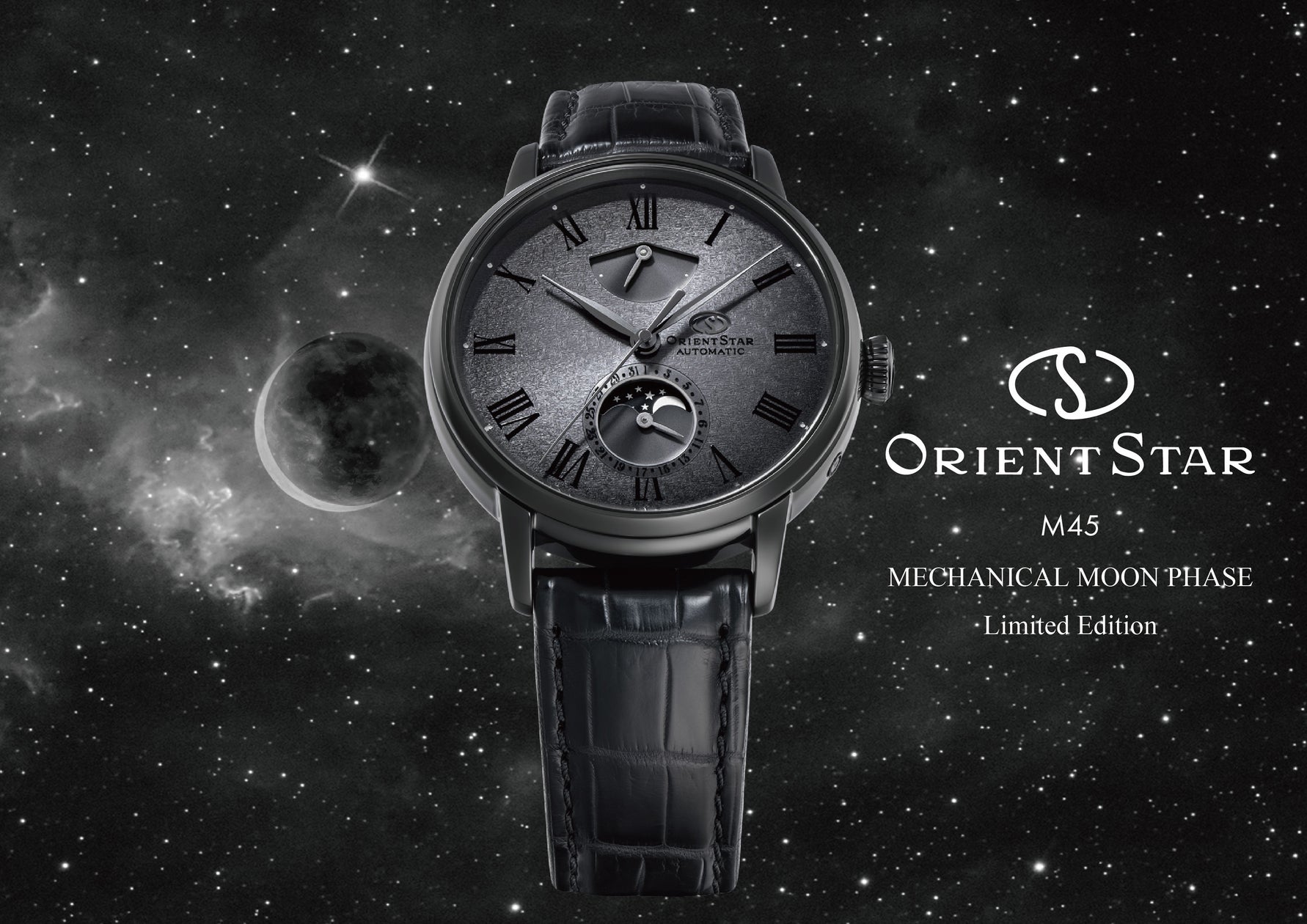 グレーグラデーションのモノトーンが前作にも増して夜空の深淵を描き出し、⽉や星団が神秘を帯びる『M45 F7 メカニカルムーンフェイズ』は、そこに起源をもつ宇宙的なスケールの「時」へと時計愛好家を誘います。数量限定の新作はオリエントスター公式オンラインストアとプレステージショップでお求めいただけます。公式オンラインストア「with ORIENT STAR」限定60 本とプレステージショップ限定140本はそれぞれにシリアルナンバーが刻印され、稀少な逸品となっています。