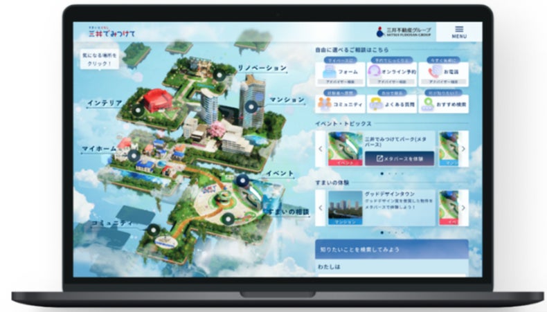 お客様がアバターでグッドデザイン賞物件(三井不動産レジデンシャルの分譲マンション等)を自由に散策・見学できるバーチャルタウンをメタバース上に創出いたしました。
