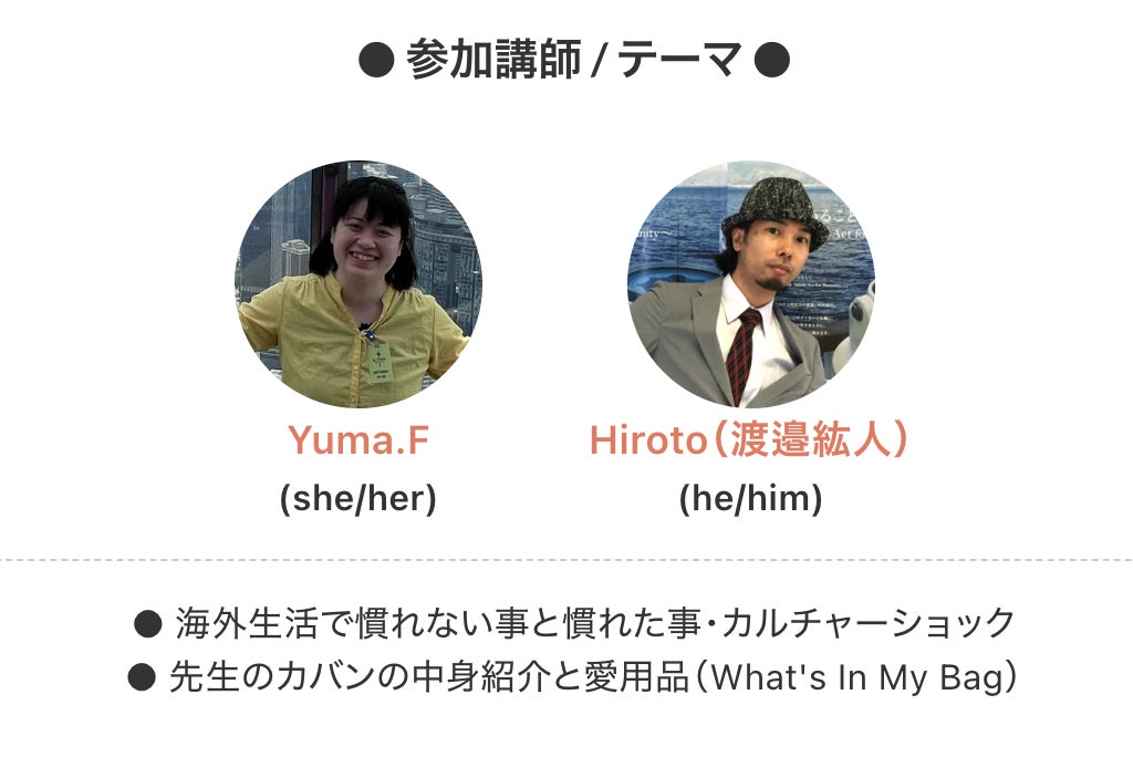 参加講師:Yuma.F(プロフィール:https://cafetalk.com/tutor/profile/?c=eJzz9fJKTjfyMjc1SwmITEssLPE1zI1Mt7UFAF2zB6g.&lang=ja)、Hiroto(渡邉紘人)(プロフィール:https://cafetalk.com/tutor/profile/?c=eJxzdy1Mt9APctd3D3b2LtPWTirxKMxOt7UFAFn%7EB2M.&lang=ja)