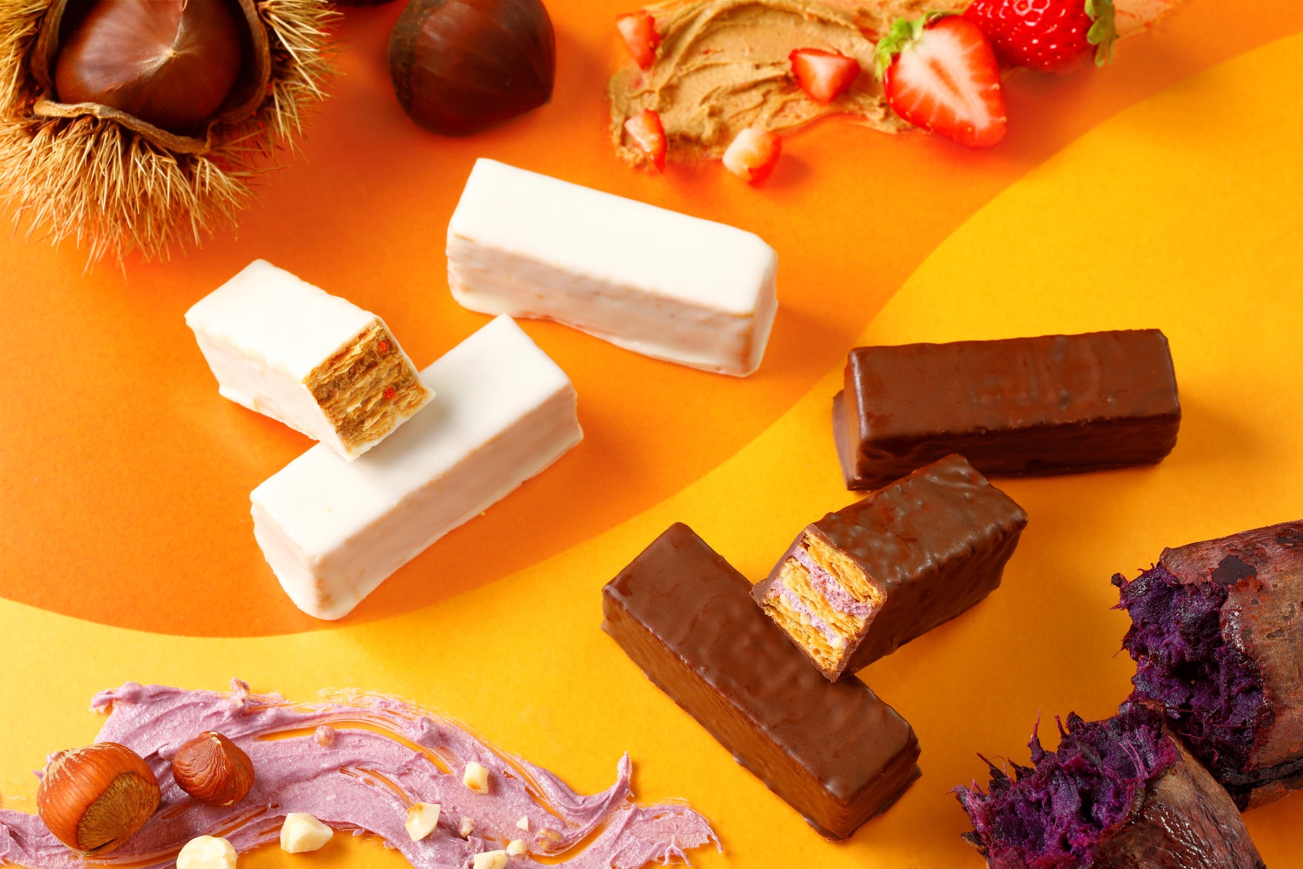 『紫芋』は、刻みヘーゼルナッツを忍ばせた紫芋のクリームをサクサクのパイでサンドし、スイートチョコレートでコーティングしました。紫芋のほっくりとした甘さとヘーゼルナッツの香ばしい風味が、食欲をそそります。