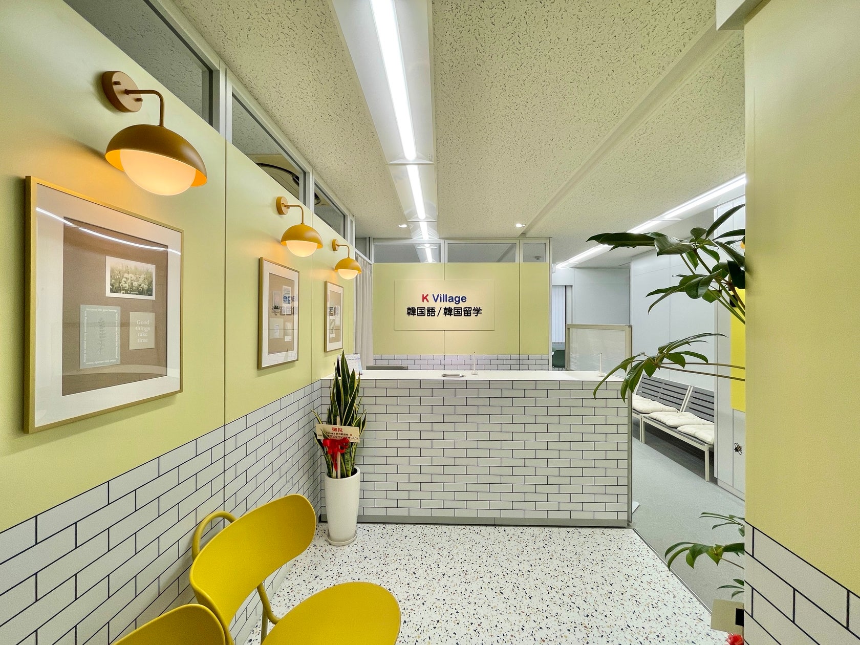 校舎のテーマは【ハチミツ】となっており、K Village韓国語では初のイエローで室内を統一しました。デザイナーが韓国のカフェに直接足を運び、韓国のカフェをイメージしてデザインしました。